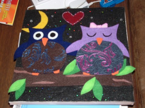 Okay, so this has absolutely nothing to do with writing, but occasionally I do things besides read and write. Usually it’s another creative endeavor and it usually still involves paper. These are my two most recent projects and no, my husband and children’s faces are not really green on the finished product. 🙂 They are both pieces done on canvas, the first is all paper, and the second is felt pieced onto the canvas.
